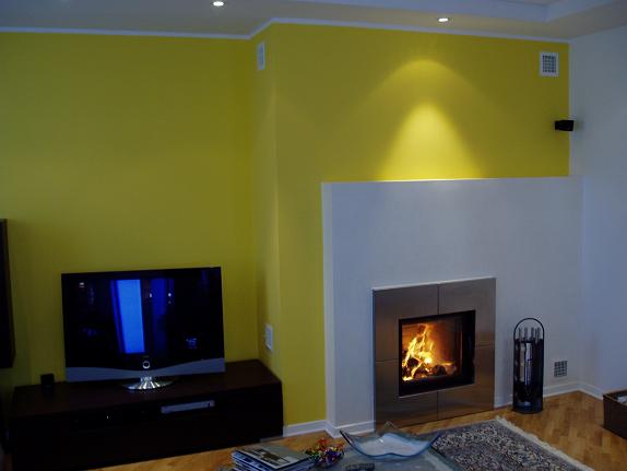 caminetto austroflamm irony 2 con cornicce in accaio satinato,rivestito con cartongesso