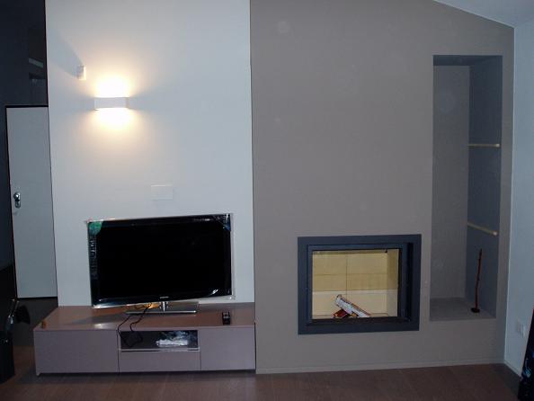 caminetto stuv 21/85 rivestito in cartongesso con spazio per mensole e mobile laterale
