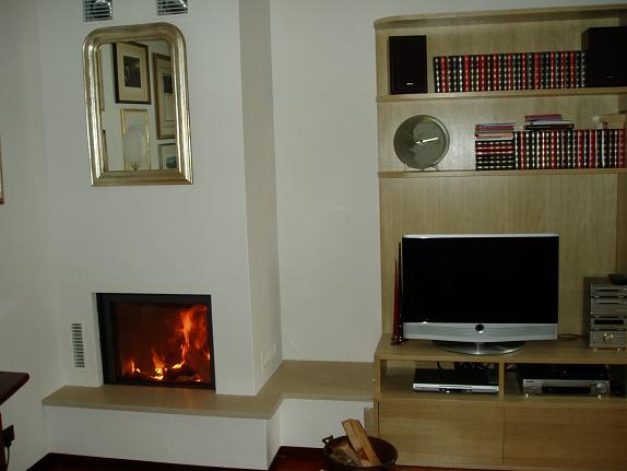 caminetto stuv 21/75 rivestito in cartongesso e piano in marmo