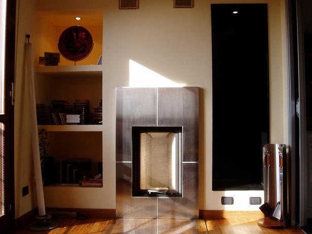caminetto irony 3 con cornice in acciaio satinata,rivestito in cartongesso con mensole e nicchia porta legna e faretti
